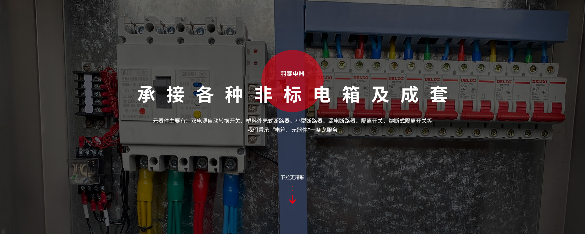 本公司坐落于人杰地靈,“中國制造之都“浙江省臺州市-黃巖。專注工業電氣領域,是一家集科研、生產、銷售為一體的較全方面型電氣企業。主要生產:低壓成套配電箱、配電柜、電表箱、動力箱、照明箱、工地臨時箱、設備控制箱,以及各種元器件。元器件主要有:雙電源自動轉換開關、塑料外殼式斷路器、小型斷路器、漏電斷路器;隔離開關、熔斷式隔離開關等,公司產品嚴格按照國家CQC,CCC標準執行,滿足于家庭與工業要求。我們秉承“電箱、元器件"一條龍服務。